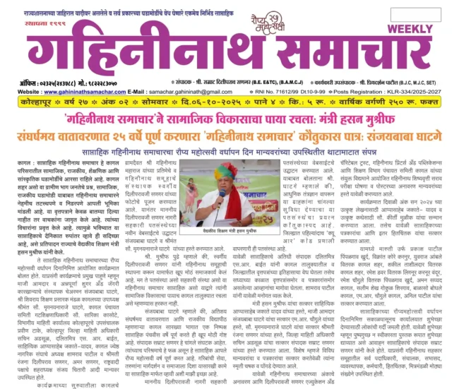 गहिनीनाथ समाचार अंक ३ दिनांक ०९-१०-२०२५ रौप्यमहोत्सवी गहिनीनाथ समाचार गेली २७ वर्ष अखंडित दर सोमवारी प्रकाशित होत असून गेले २२ वर्ष शासनमान्य जाहिरात यादीवर आहे. देशातील घडामोडी तसेच परिसरातील घटना निर्भीडपणे मांडण्याचा आमचा प्रयत्न असतो. शिक्षण, आरोग्य, पर्यावरण, राजकारण, अंधश्रद्धा, शेती, युवकांच्या समस्या अशा अनेक प्रश्नावर ‘गहिनीनाथ समाचार’ मध्ये लिहिले जाते. प्रबोधनात्मक अनेक लेखावर चांगल्या … Read more