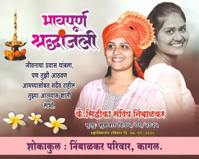 निधन वार्ता – कु. सिद्धीका संदीप निंबाळकर 06/09/2025 by gahininath samachar कु. सिद्धीका संदीप निंबाळकर वय १९ रा. कागल हिचे आकस्मित निधन झाले, त्यांच्या पश्चात आई वडील भाऊ बहीण चुलते असा मोठा परिवार आहे. रक्षाविसर्जन उद्या ०७ सप्टेंबर रोजी सकाळी १० वाजता कागल स्मशानभूमी येथे आहेAdvertisements AD1