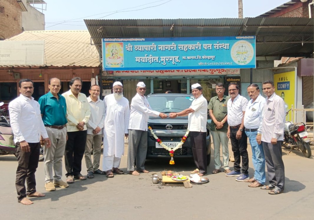 मुरगूड ( शशी दरेकर ) : मुरगूड ता. कागल येथील सर्वांच्या परिचयाची व आपुलकीची पतसंस्था म्हणून ओळखल्या जाणाऱ्या श्री. व्यापारी नागरी सहकारी पतसंस्थेतर्फे संस्थेचे निकटवर्ती मा. श्री. रंगराव विठ्ठल पाटील रा. सुरुपली यांना नवीन फोर व्हीलर ” टाटा पंच” गाडीचे वितरण करण्यात आले.