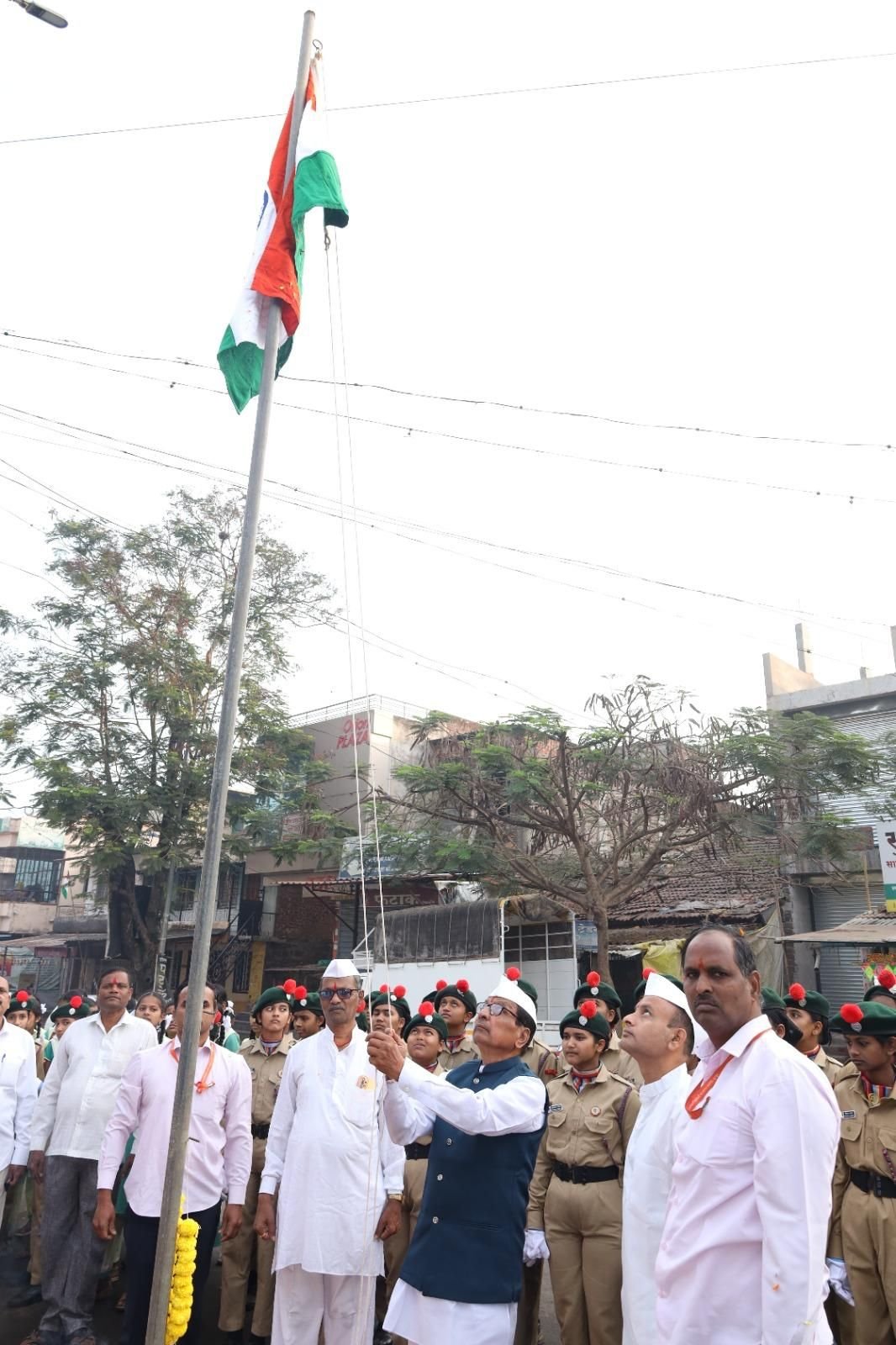 शहरातील पसंस्था, शासकीय कार्यलये, प्राथमिक, माध्यमिक,व उच्च महाविद्यालयातून तेथील प्रमुखांच्या हस्ते ध्वजारोहण करण्यात आले. मुलांना जिलेबी वाटण्यात आली.