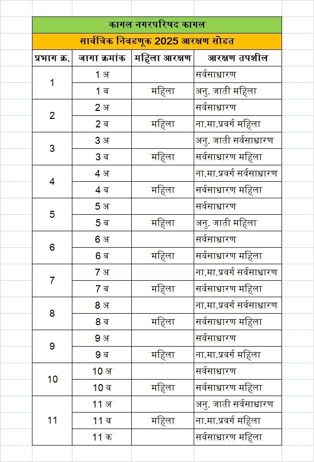 कागल: आगामी कागल नगरपरिषद सार्वत्रिक निवडणूक २०२५ साठी प्रभागनिहाय आरक्षण सोडत आज जाहीर करण्यात आली. या सोडतीमुळे इच्छुकांचे लक्ष लागलेल्या अनेक प्रभागांमधील राजकीय समीकरणे बदलली आहेत.