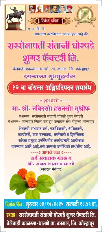 कोल्हापूर: बेलेवाडी काळम्मा-धामणे, ता. कागल, जि. कोल्हापूर येथील सरसेनापती संताजी घोरपडे शुगर फॅक्टरी लि. चा १२ वा बॉयलर अग्नीप्रदीपन समारंभ गुरुवारी (०२/१०/२०२५) रोजी सकाळी १०.४९ वाजता फॅक्टरीच्या शुभमुहूर्तावर आयोजित करण्यात आला आहे.