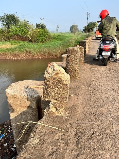 खालून पाण्याचा वाहता प्रवाह आहे.पुलावरून शाळेची मुले पायी, सायकल किंवा दुचाकीवरून जातात. वडाप व अवजड वाहनांची पण वाहतूक सुध्दा सुरू असते.तुटलेल्या खांबामुळे वाहतुकीचा अंदाज येत नाही असे वाहन चालकांचे म्हणणे आहे.